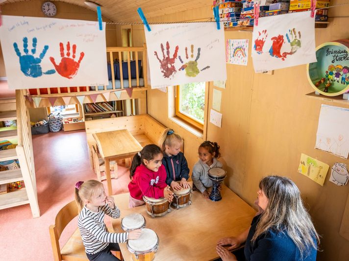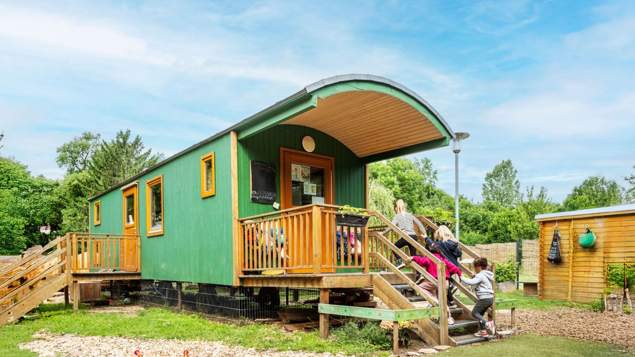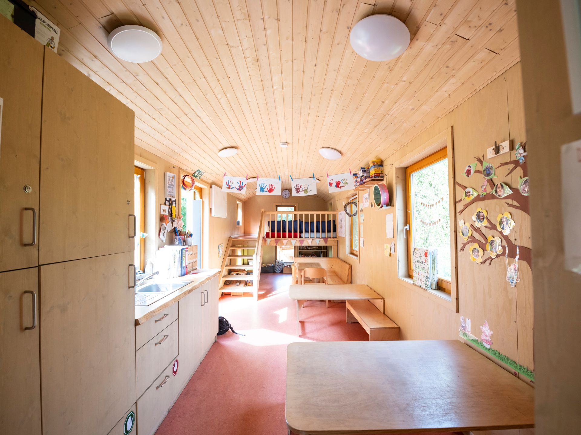 Als Rückzugsort, für Ruhe- und Schlafphasen sowie bei Unwetter, steht uns das Herzstück unserer Kita – ein wunderschöner Bauwagen – zur Verfügung.